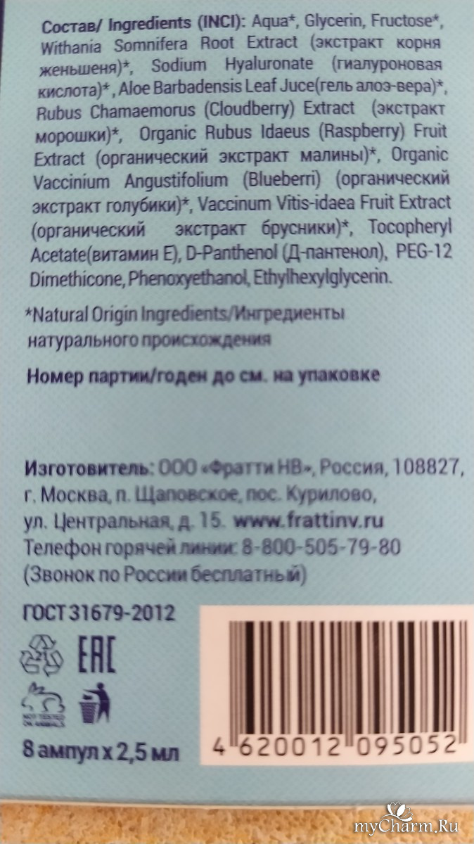 Состав: Aqua*, Glycerin, Fructose*, Withania Somnifera Root Extract (экстракт корня женьшеня)*, Sodium Hyaluronate (гиалуроновая кислота)* , Aloe Barbadensis Leaf Juce(гель алоэ-вера)*, Rubus Chamaemorus (Cloudberry) Extract (экстракт морошки)*, Organic Rubus Idaeus (Raspberry) Fruit Extract (органический экстракт малины)*, Organic Vaccinium Angustifolium (Blueberri) (органический экстракт голубики)*, Vaccinum Vitis-idaea Fruit Extract (органический экстракт брусники)*, Tocopheryl Acetate(витамин Е), D-Panthenol (Д-пантенол), PEG-12 Dimethicone, Phenoxyethanol, Ethylhexylglycerin. *Natural Origin Ingredients/Ингредиенты натурального происхождения
