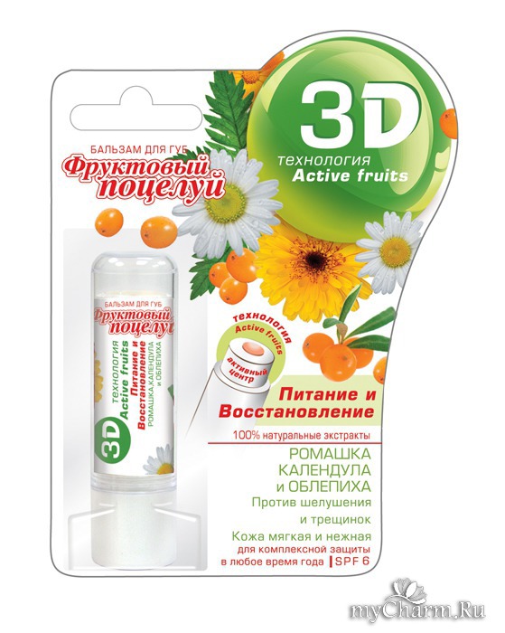 myCharm.Ru → Фруктовый поцелуй Бальзам для губ 3D: Питание и восстановление "РОМАШКА, КАЛЕНДУЛА и ОБЛЕПИХА"