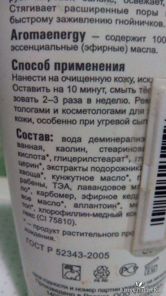 Состав: Вода деминерализованная, каолин, стеариновая кислота*, глицерилстеарат*, глицерин*, кунжутное масло*, экстракты подорожника*, хвоща*, эфирное масло лаванды*, эфирное масло кедра*, карбомер, аллантоин*, ментол*, ксантановая смола*, парабены, ТЭА, хлорофиллин-медный комплекс (CI 75810).