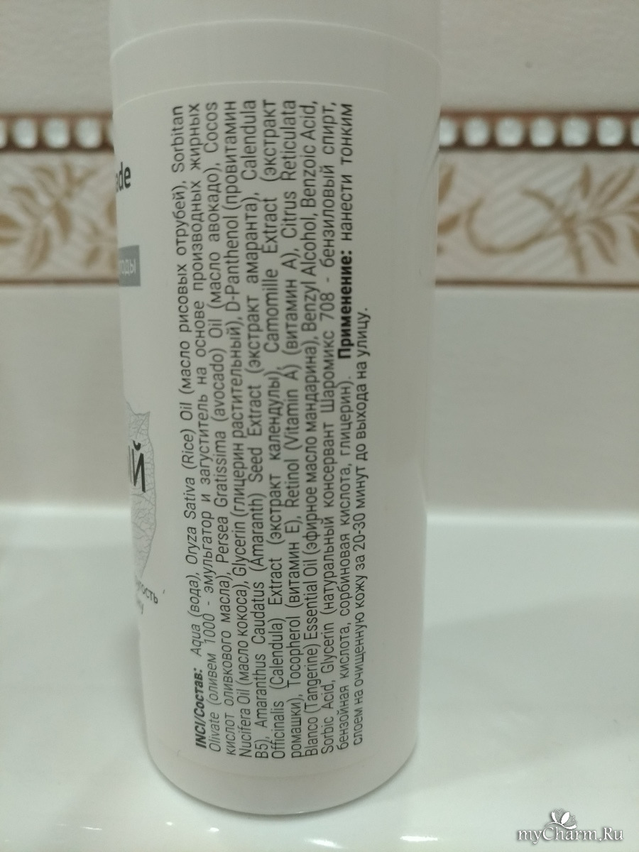 Состав: Aqua (вода), Oryza Sativa (Rice) Oil (масло рисовых отрубей), Sorbitan Olivate (оливем 1000 - эмульгатор и загуститель на основе производных жирных кислот оливкового масла), Persea Gratissima (avocado) Oil (масло авокадо), Cocos Nucifera Oil (масло кокоса), Glycerin (глицерин растительный), D-Panthenol (провитамин В5), Amaranthus Caudatus (Amaranth) Seed Extract (экстракт амаранта), Calendula Officinalis (Calendula) Extract (экстракт календулы), Camomille Extract (экстракт ромашки), Tocopherol (витамин Е), Retinol (Vitamin A) (витамин А), Citrus Reticulata Blanco (Tangerine) Essential Oil (эфирное масло мандарина), Benzyl Alcohol, Benzoic Acid, Sorbic Acid, Glycerin (натуральный консервант Шаромикс 708 - бензиловый спирт, бензойная кислота, сорбиновая кислота, глицерин).