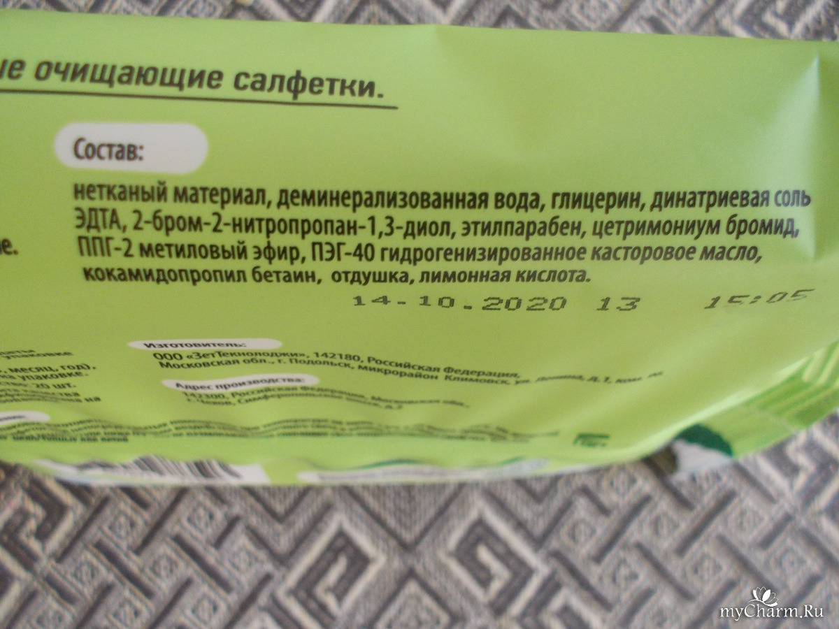 Состав: нетканый материал, деминерализованная вода, глицерин, динатриевая соль ЭДТА, 2-бром-2-нитропропан-1,3 диол, этилпарабен, цетримониум бромид, ППГ-2 метиловый эфир, ПЭГ-40 гидрогенизированное касторовое масло, кокамидопропил бетаин, отдушка, лимонная кислота.