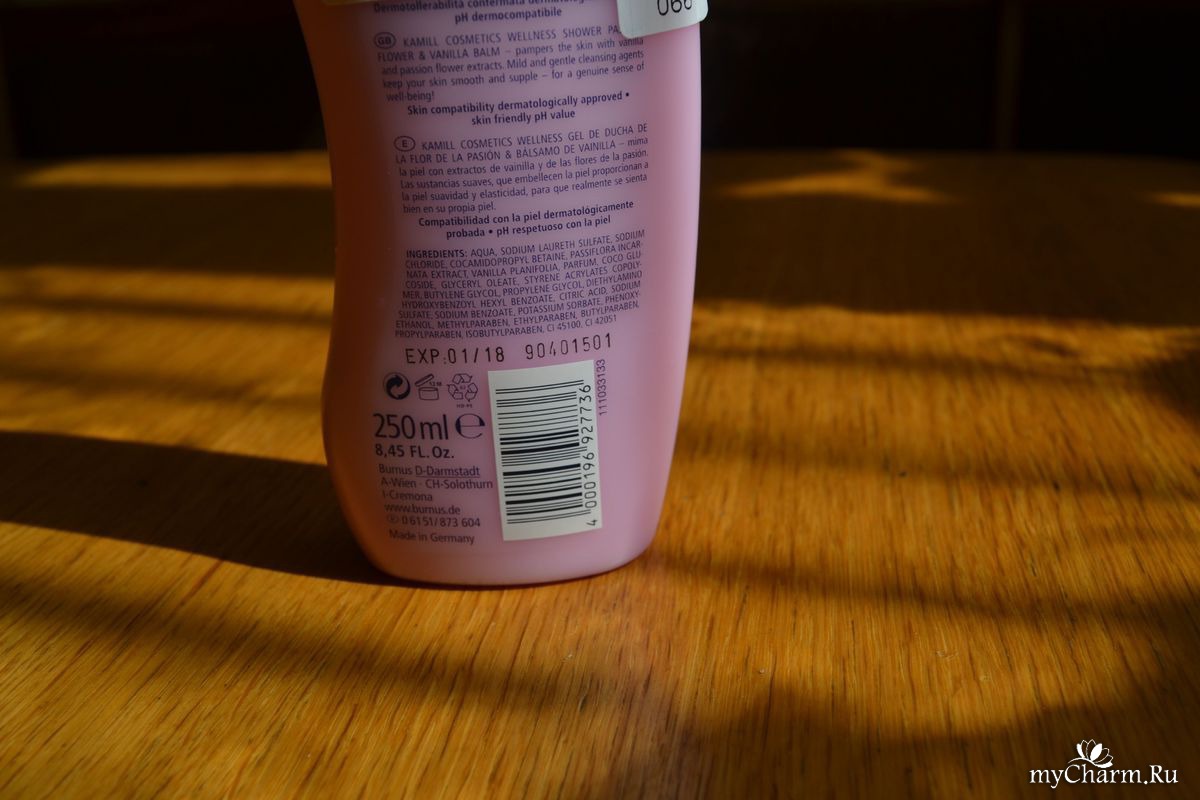 Купила новый гель для душа, понравился приятный аромат, да и захотелось чего то новенького. Гель для душа немецкого производства, срок годности 36 месяцев. Довольно плотной, белой консистенции, я бы сказала похож даже больше на жидкий крем. Пениться не очень сильно, в меру, хватает небольшого количества, для всего тела, экономный! После того, как смываешь гель, тело приятное на ощупь, кожа становиться такая мягка, нежная. Эффект, как после увлажняющего крема для тела. Мне понравился гель, хороший продукт и цена отличная.