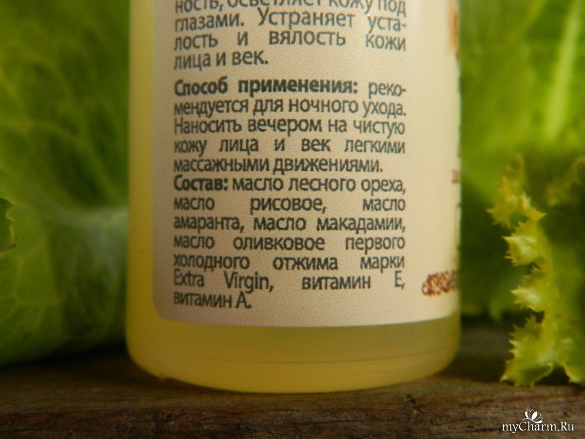 Состав: масло лесного ореха, оливковое масло, масло макадамии, рисовое масло, масло Ши, витамин Е, витамин А. Не содержит синтетических консервантов, отдушек и красителей.