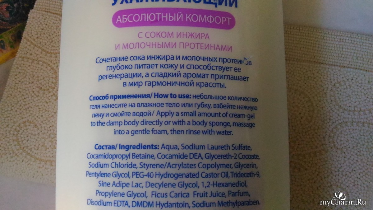 Состав: Aqua, Sodium Laureth Sulfate, Cocamidopropyl Betaine, Cocamide DEA, Glycereth-2 Cocoate, Sodium Chloride, Styrene/Acrylates Copolymer, Glycerin, Pentylene Glycol, PEG-40 Hydrogenated Castor Oil, Trideceth-9, Sine Adipe Lac, Decylene Glycol, 1,2-Hexanediol, Propylene Glycol, Ficus Carica Fruit Juice, Parfum, Disodium EDTA, DMDM Hydantoin, Sodium Methylparaben.