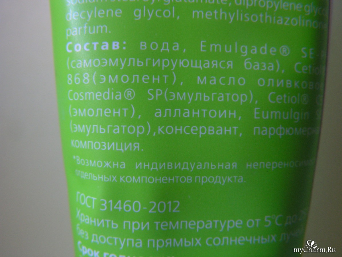 Состав: aqua, ethylhexyl stearate, glyceryl stearate, ceteareth-20, ceteareth-12, cetearyl alcohol, cetylpalmitate, olea europaea (olive) oil, sodium polyacrylate, allantoin, sodium stearoyl glutamate, dipropylene glycol, decylene glycol, methylisothiazolinone, parfum.