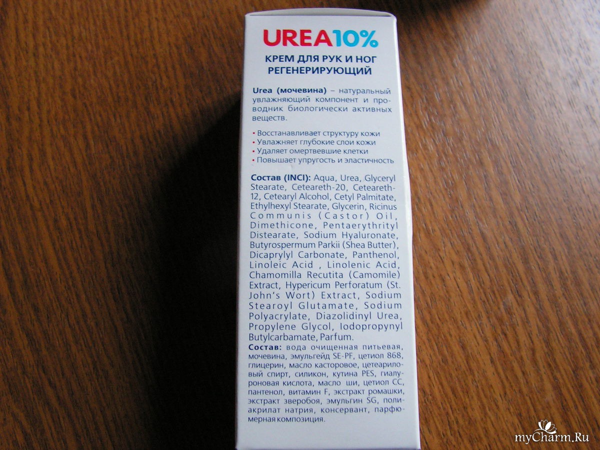 Состав: вода очищенная питьевая, мочевина, эмульгейд SE-PF, цетиол 868, глицерин, масло касторовое, цетеариловый спирт, силикон, кутина PES, гиалуроновая кислота, масло ши, цетиол CC, пантенол, витамин F, экстракт ромашки, экстракт зверобоя, эмульгин SG, полиакрилат натрия, консервант, парфюмерная композиция.