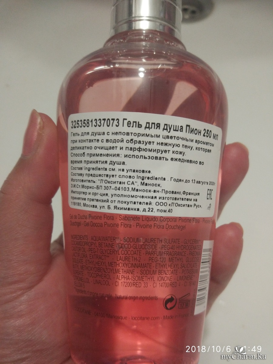 Состав: AQUA/WATER, SODIUM LAURETH SULFATE, COCAMIDOPROPYL BETAINE, COCO-GLUCOSIDE, PEG-7 GLYCERYL COCOATE, PARFUM (FRAGRANCE), PEG-40 HYDROGENATED CASTOR OIL, LAURETH-2, SODIUM BENZOATE, PEG-120 METHYL GLUCOSE DIOLEATE, BENZYL SALICYLATE, ETHYLHEXYLGLYCERIN, PAEONIA LACTIFLORA ROOT EXTRACT, ALPHA-ISOMETHYLIONONE, LINALOOL, CITRUS GRANDIS (GRAPEFRUIT) PEEL OIL, LIMONENE, METHYLISOTHIAZOLINONE, ROSA DAMASCENA FLOWER OIL, TOCOPHEROL, POTASSIUM SORBATE.