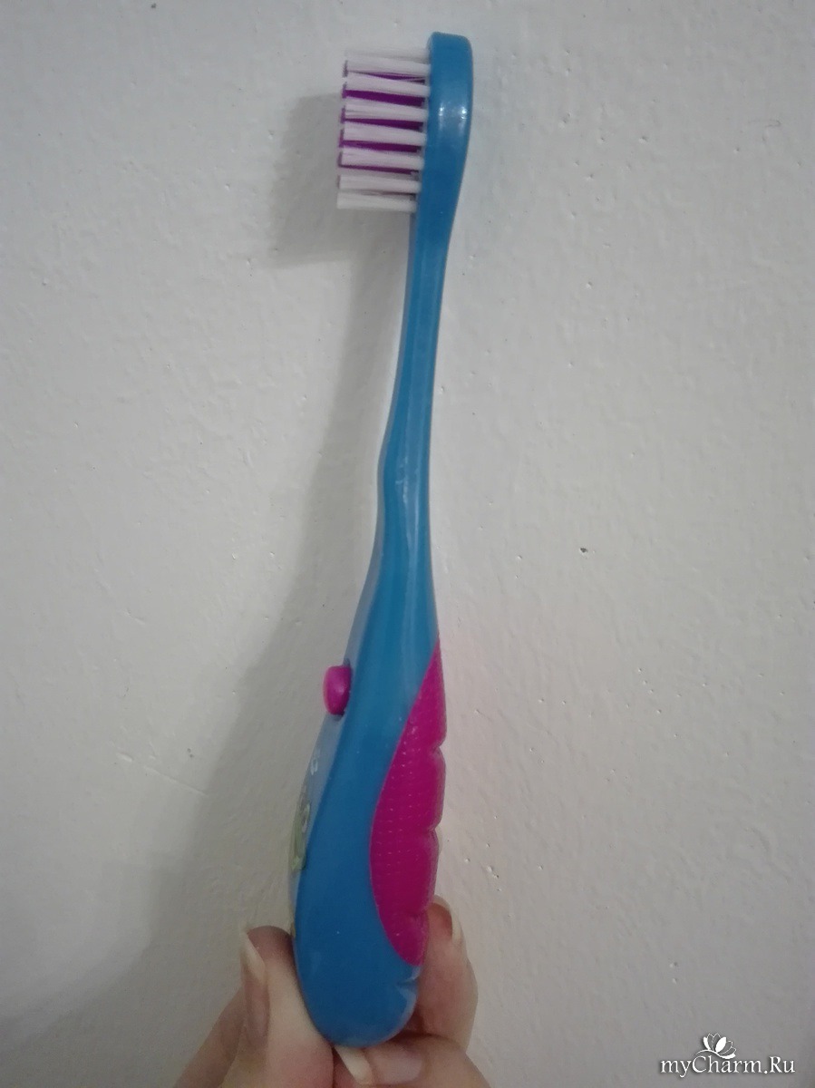Зубная щетка из серии Забавные зверята имеет музыкальный таймер, 1минуту играет музыка пока рабенок чистит зубы. Не надо засекать время, всего два раза нажали на кнопку таймера и положенные две минутки чистим зубы. Ребёнок с большим удовольствием чистит зубы такой щеткой. Сама щетка с мягкой щитиной, удобной головкой средней величины.