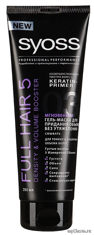 Новый SYOSS FULL HAIR 5, разработанный и протестированный совместно со стилистами, - первый профессиональный уход за волосами, направленный на улучшение пяти показателей здоровья волос: средства делают волосы более густыми, придают им объем, силу, сокращают выпадение волос, вызванное их ломкостью, а также стимулируют работу волосяных луковиц...