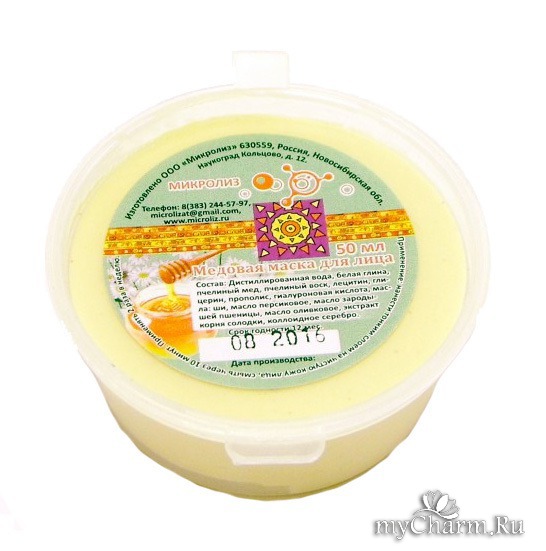 Состав: Дистиллированная вода, белая глина, мед пчелиный, воск пчелиный, лецитин, глицерин, прополис, гиалуроновая кислота, масла: ши, масло персиковое, масло зародышей пшеницы, масло оливковое; экстракты: корня солодки, пихты; коллоидное серебро.