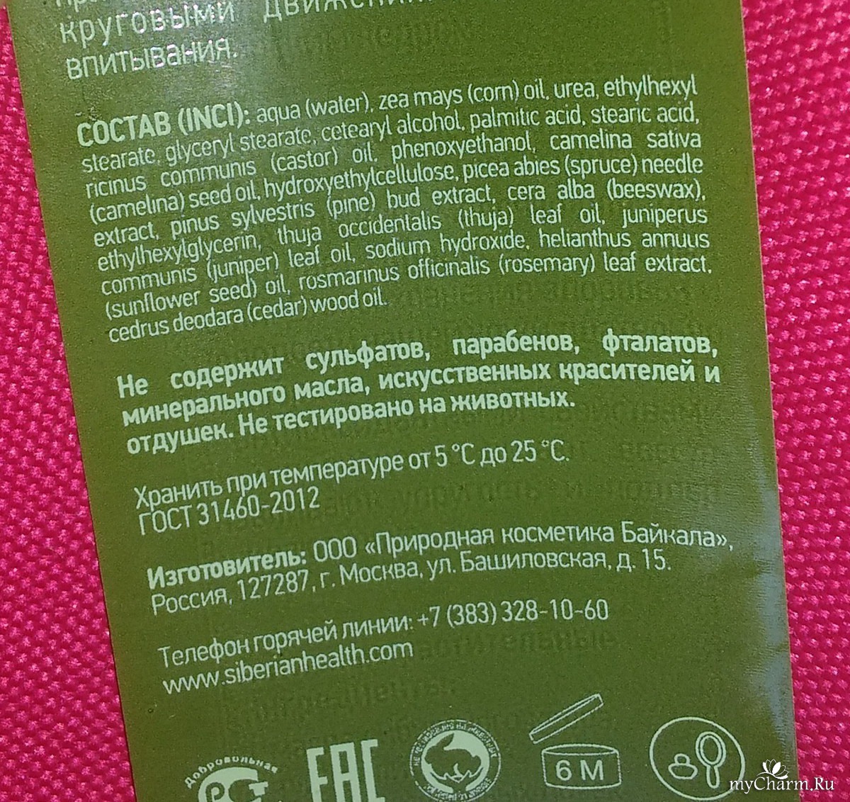Состав: aqua (water), zea mays (corn) oil, urea, ethylhexyl stearate, glyceryl stearate, cetearyl alcohol, palmitic acid, stearic, acid, ricinus commununis (Castrol) oil, phenoxyethanol, camelina sativa (camelina) seed oil, hydroxyethycellulose, picea abies (spruce) needle extract, pinus sylvestris (pine) bud extract, cera alba (beeswax, thuja occidentalis (thuja) leaf oil, juniperus communis (juniper)leaf oil, sodium hydroxide, helianthus annuus (sunflower seed) oil, rosmarinus officinalis (rosemary) leaf extract cedrus deodara (cedar) wood oil.