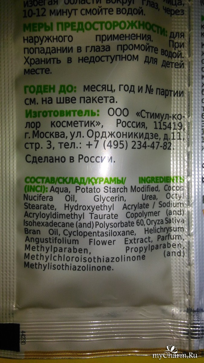 Маски для лица NaturaЛист – это натуральные продукты для ухода за кожей. И «натуральные» здесь не просто маркетинговый ход. Если мы посмотрим в состав, то увидим натуральные компоненты на первых позициях. В маска омолаживающей «Крахмальная» после воды сразу идет крахмал, затем натуральное масло Cocos Nicifera Oil, затем мочевина и далее остальные ингредиенты. Среди ценного в составе также рисовое масло и бессмертник.