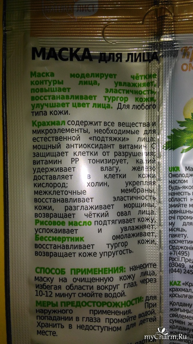Честно говоря, до этого не знала о том, как крахмал полезен для кожи. Как говорится, век живи – век учись. В крахмале содержится всё необходимое для подтягивания кожи лица. Это и антиоксидант витамин С, и железо, и холин, и витамин РР. Все они восстанавливают тургор, эластичность кожи. Поэтому состав действительно многообещающий – для омоложения кожи. Маска очень приятная, комфортная для лица. Выдержать ее надо 10 минут, затем смыть, нанести обычный крем. Кожа после маски мягкая, напитанная, упругая. Очень удобно, что маска разделена на две части. Каждую при желании можно еще разделить на две, если не наносить на шею. С шеей пакета хватит ровно на два раза. |