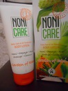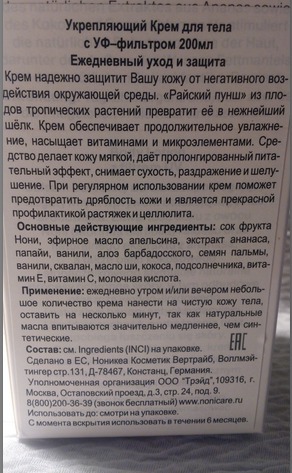 Состав: вода, экстракты фрукта Нони, алое вера, папайи, ананаса, ванили, масло кокоса, масло ши, масло кожуры сладкого апельсина, масло подсолнечника, экстракт карликовой пальмы, сквалан, витамин Е и С.