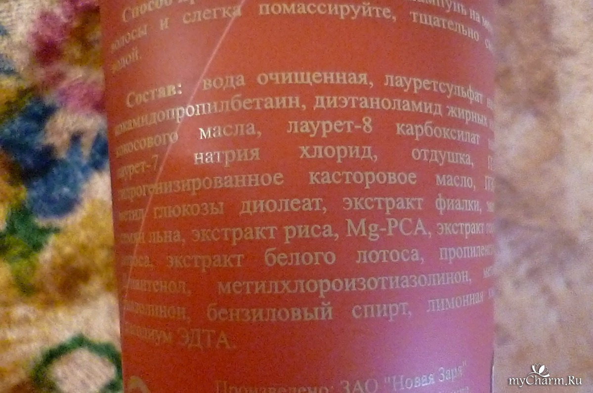 Состав: Вода очищенная, лауретсульфат натрия, кокамидопропилбетаин, гидрогенизированное касторовое масло,экстракт фиалки,экстракт семян льна, экстракт риса,экстракт голубого лотоса, экстракт белого лотоса, Mg-PCA, Д-пантенол, пропиленгликоль, бензиловый спирт, лимонная кислота, дисодиум ЭДТА.