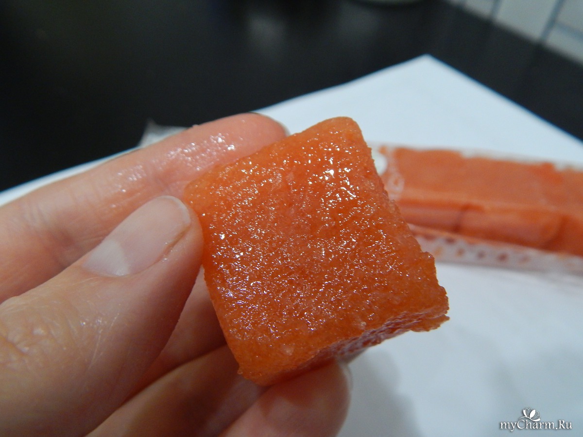Начну с того, что сахарный скраб для тела "Спелая дыня" уже своим внешним видом: кубики мармелада, посыпанные сахаром, с запахом дыни, вызывает восторг и море эмоций. Перейду к использованию, кубик дыни тает в буквальном смысле прямо в руках, оставляя "сумасшедший" запах и гелеобразный след, который легко мылится при взаимодействии с водой и нежно скользит по коже, хорошо ее очищая и совсем не сушит, а наоборот, придает увлажнение. Кожа становится гладкой, нежной на ощупь, естественной увлажненной, приобретает ровный розовый цвет и чудесно пахнет.