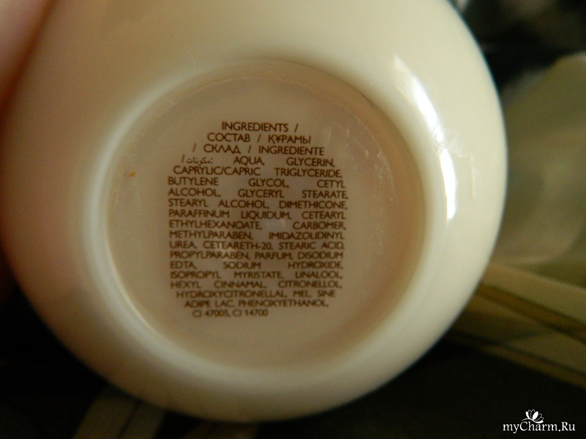 Состав: AQUA, GLYCERIN, CAPRYLIC/CAPRIC TRIGLYCERIDE, BUTYLENE GLYCOL, CETYL ALCOHOL, GLYCERYL STEARATE, STEARYL ALCOHOL, DIMETHICONE, PARAFFINUM LIQUIDUM, CETEARYL ETHYLHEXANOATE, CARBOMER, METHYLPARABEN, IMIDAZOLIDINYL UREA, CETEARETH-20, STEARIC ACID, PROPYLPARABEN, PARFUM, DISODIUM EDTA, SODIUM HYDROXIDE, ISOPROPYL MYRISTATE, LINALOOL, HEXYL CINNAMAL, CITRONELLOL, HYDROXYCITRONELLAL, MEL, SINE ADIPE LAC, PHENOXYETHANOL, CI 47005, CI 14700