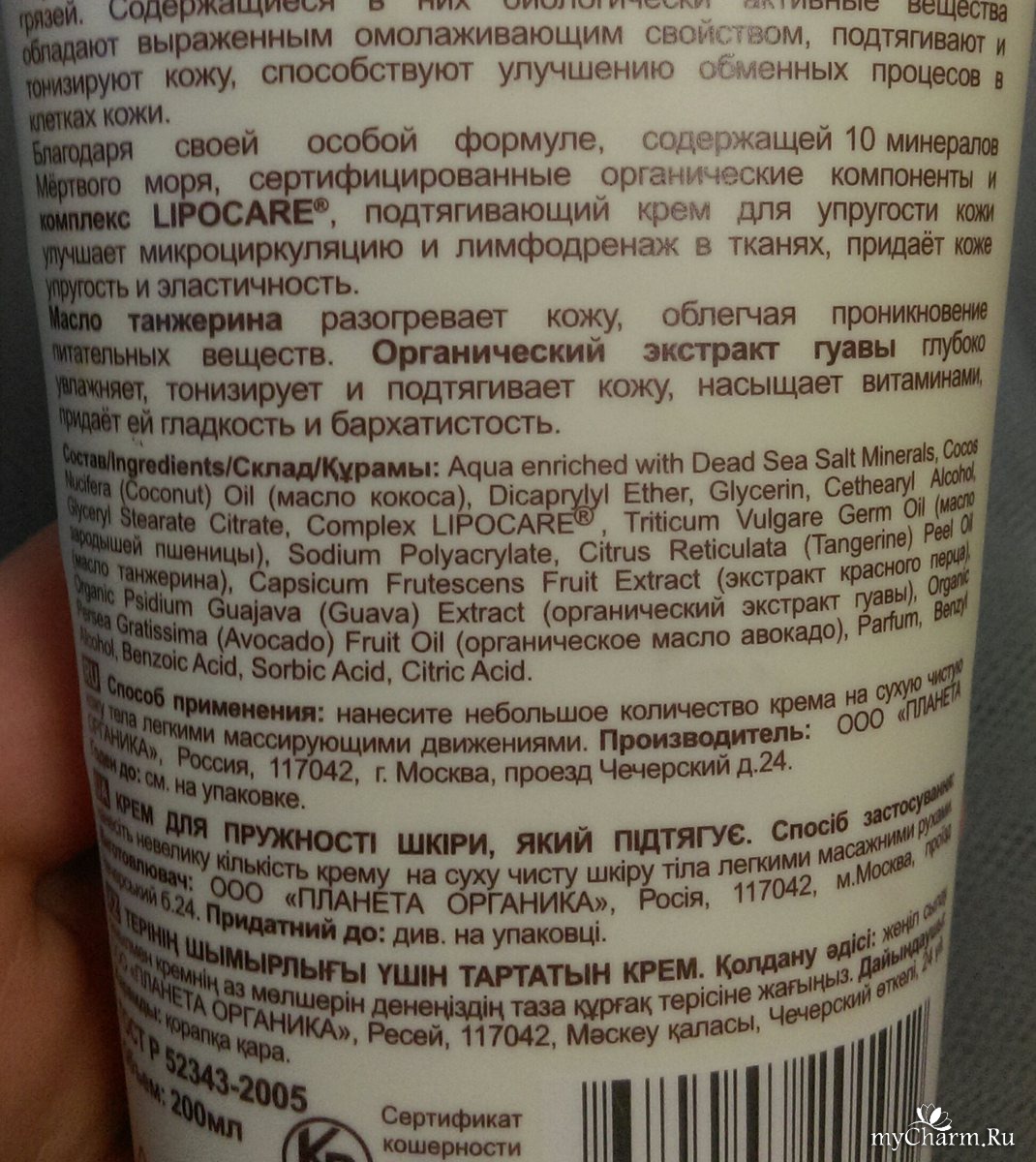 Состав: Aqua enriched with Dead Sea Salt Minerals, Cocos Nucifera (Coconut) Oil, Dicaprylyl Ether, Glycerin, Cethearyl Alcohol, Glyceryl Stearate Citrate, Complex LIPOCARE®, Triticum Vulgare Germ Oil, Sodium Polyacrylate, Citrus Reticulata (Tangerine) Peel Oil (масло танжерина), Organic Psidium Guajava (Guava) Extract (органический экстракт гуавы), Parfum, Benzyl Alcohol, Benzoic Acid, Sorbic Acid, Citric Acid