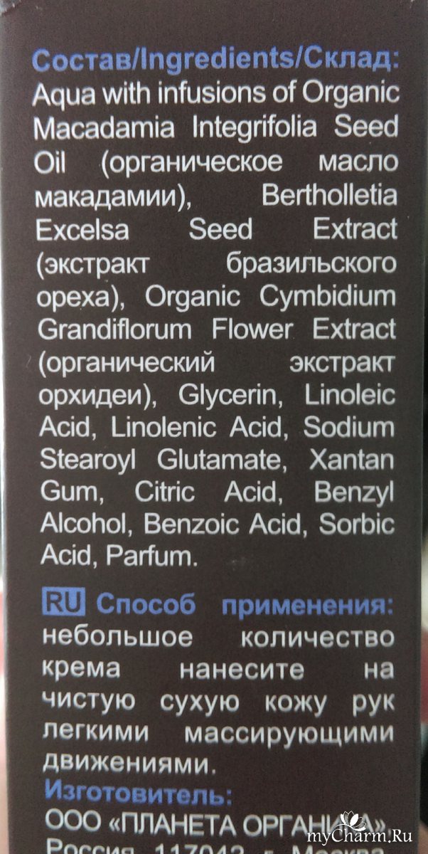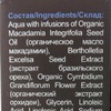 Состав: Aqua with infusions of organic macadamia integrifolia seed oil, bertholletia excelsa seed extract, organic cymbidium grandiflorum flower extract, glycerin, linoleic acid, linolenic acid, sodium stearoyl glutamate, xantan gum, citrus acid, benzyl alcohol, benzoik acid, sorbic acid, parfum.
