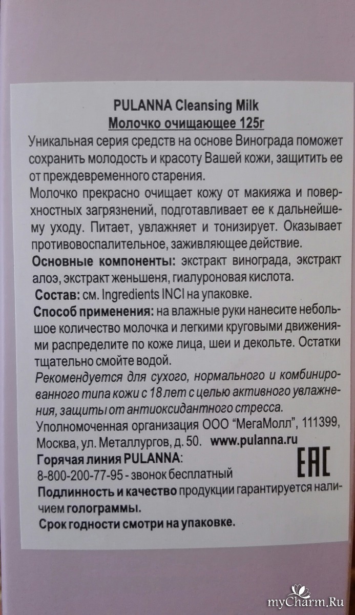 myCharm.Ru → PULANNA Молочко очищающее Серия на основе Винограда