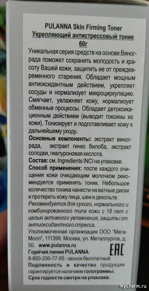 myCharm.Ru → PULANNA Укрепляющий антистрессовый тоник Серия на основе Винограда