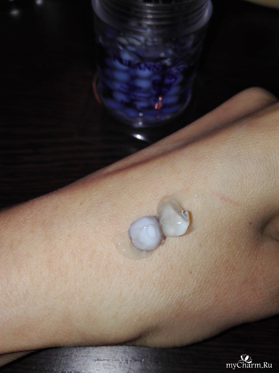 Внешнее оформление крема просто из области фантастики. Маленькие шарики крема аккуратно уложены в ряды в баночку с гелем. И для применения необходимо взять один шарик и столько же геля, все перемешать и использовать.