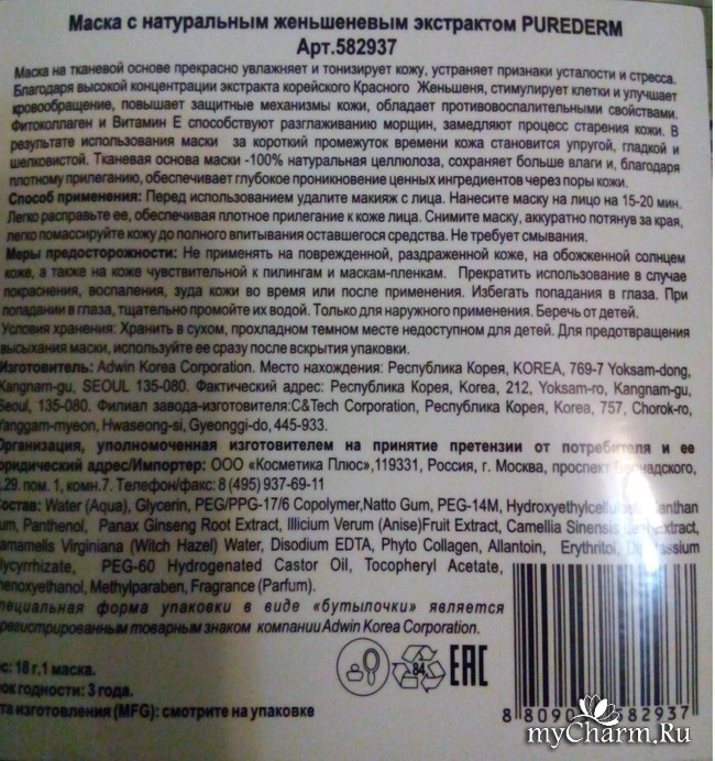 myCharm.Ru → Purederm Маска с натуральным женьшеневым экстрактом