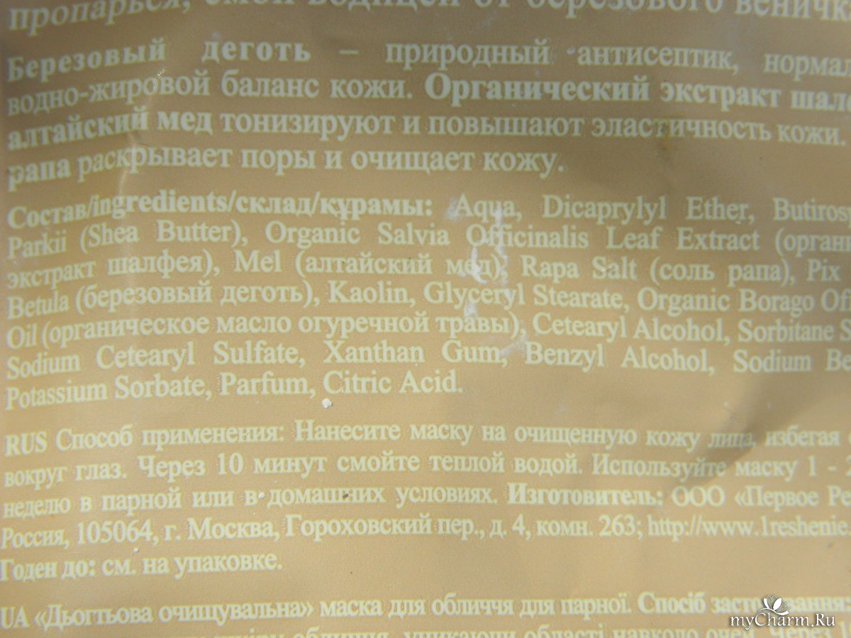 Состав: Aqua, Dicaprylyl Ether, Butirospermum Parkii (Shea Butter), Organic Salvia Officinalis Leaf Extract (органический экстракт шалфея), Mel (алтайский мед), Rapa Salt (соль рапа), Pix Liquida Betula (березовый деготь), Kaolin, Glyceryl Stearate, Organic Borago Officinalis Oil (органическое масло огуречной травы), Cetearyl Alcohol, Sorbitane Stearate, Sodium Cetearyl Sulfate, Xanthan Gum, Benzyl Alcohol, Sodium Benzoate, Potassium Sorbate, Parfum, Citric Acid.