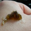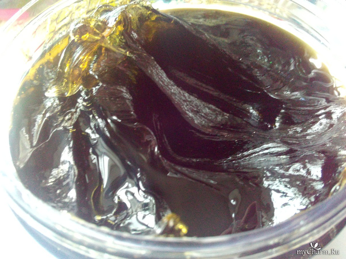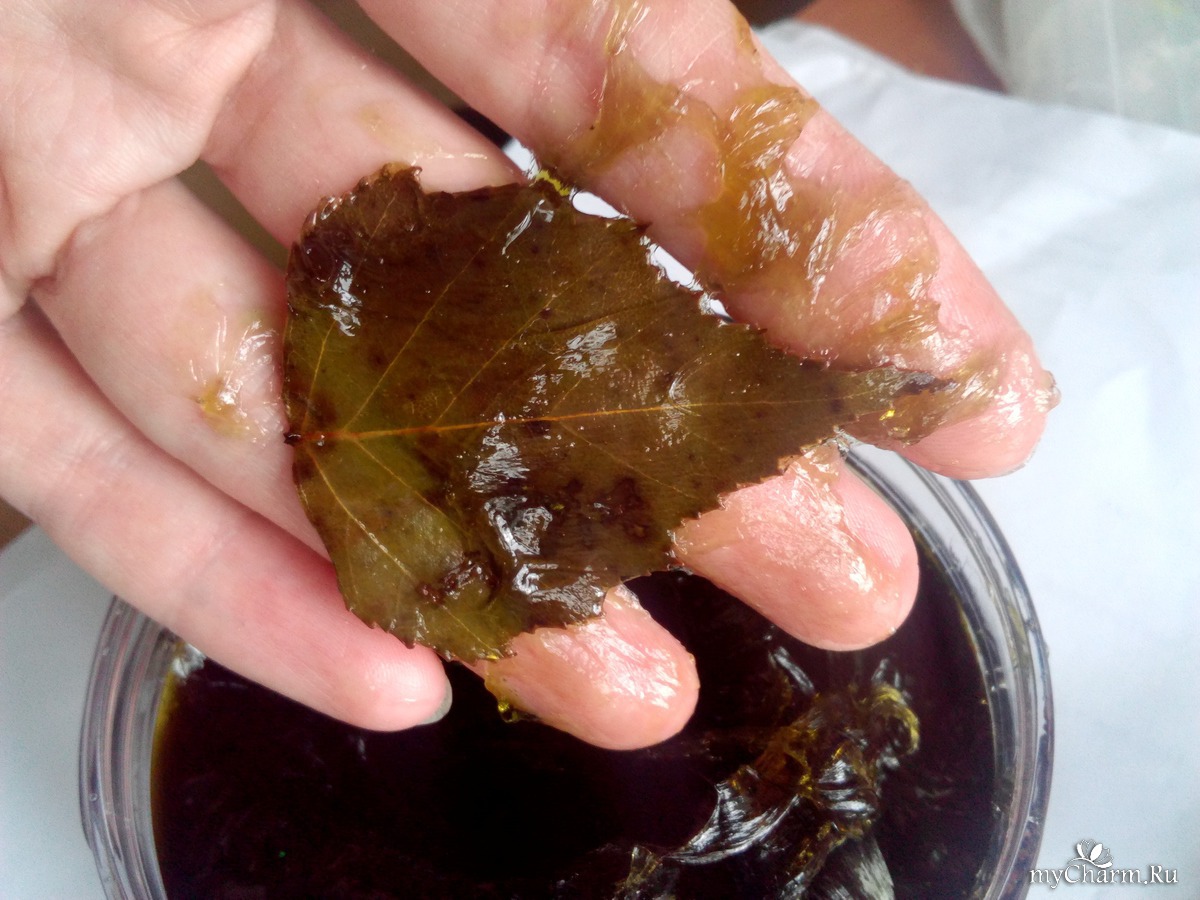 Мыло необычной консистенции, что-то среднее между медом и вазелином. Цвет скорее зеленоватый, чем черный. Очень приятно пахнет травами. Внутри сюрприз - березовый листочек.