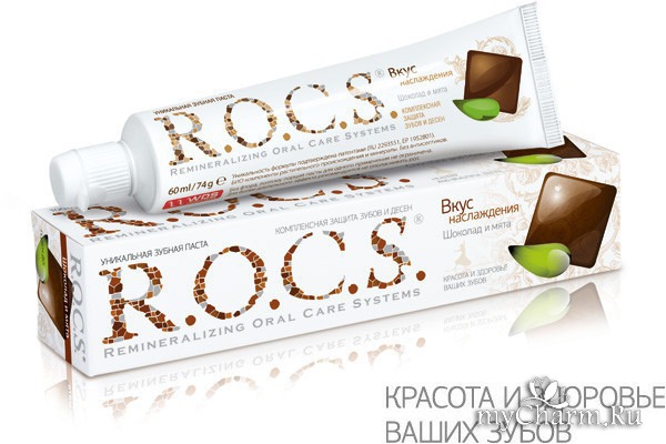 Плитка великолепного шоколада, шоколадное пирожное, шоколадное обертывание - сколько шоколадных наслаждений окружают нас! Теперь у Вас появилось еще одно шоколадное удовольствие – зубная паста R.O.C.S. с изысканным сочетанием вкусов шоколада и мяты. Предназначена для постоянного ежедневного использования взрослыми и детьми старше 4-х лет...