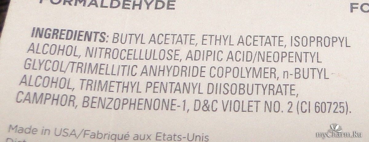 Состав: clear: butyl acetate, ethyl acetate, isopropyl alcohol, nitrocellulose, adipic acid/neopentyl glycol/trimellitic anhydride copolymer, n-butyl alcohol, trimethyl pentanyl diisobutyrate, camphor, benzophenone-1, d&c violet no. 2 (ci 60725).natural tint shine: butyl acetate, ethyl acetate, nitrocellulose, phthalic anhydride/trimellitic anhydride/glycols copolymer, isopropyl alcohol, trimethyl pentanyl diisobutyrate, diisobutyl adipate, n-butyl alcohol, benzophenone-1, acetyl tributyl citrate, alcohol denat., aqua/water/eau, stearalkonium hectorite, d&c red no. 17 (ci 26100), d&c red no. 33 (ci 17200), d&c red no. 6 barium lake (ci 15850).
