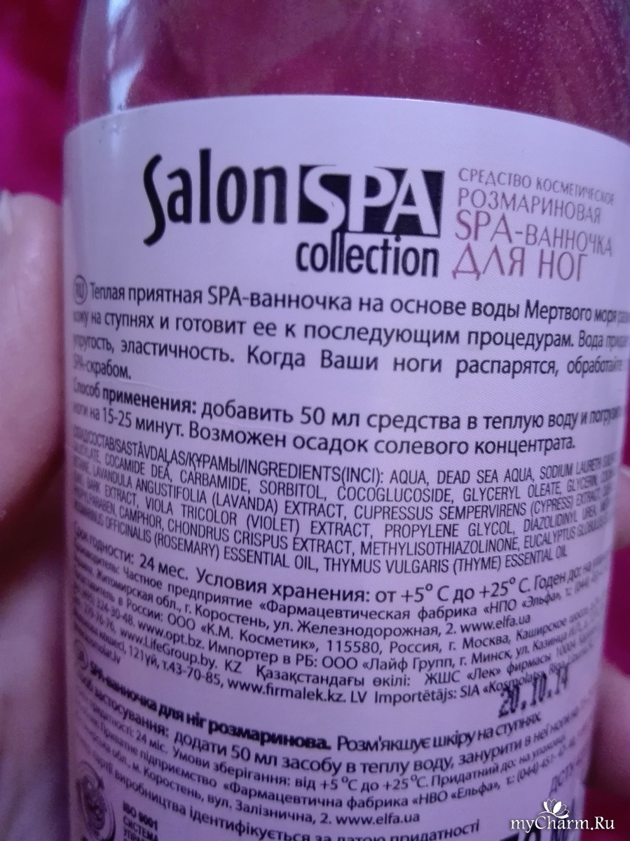 Нам всем нужна забота о наших ножках. Мне помогает в этом Спа ванночка для ног розмариновая. Немного средства около 50 мл добавляю в таз с горячей водой, получается слегка пенистый раствор и приятно пахнет лечебными травами, больше напоминающими мяту. Опускаю в раствор ноги и оставляю на 20-25 минут. Распарив ноги со средством Spa Collection далее беру пемзу обрабатываю пяточки. Омертвевшая кожа легко сходит и ступни становятся гладкими и мягкими. Ноги увлажнены, приятно пахнут и нежные на ощупь. Состав указан на английском языке, поэтому не могу сказать что в него входит, но указано,