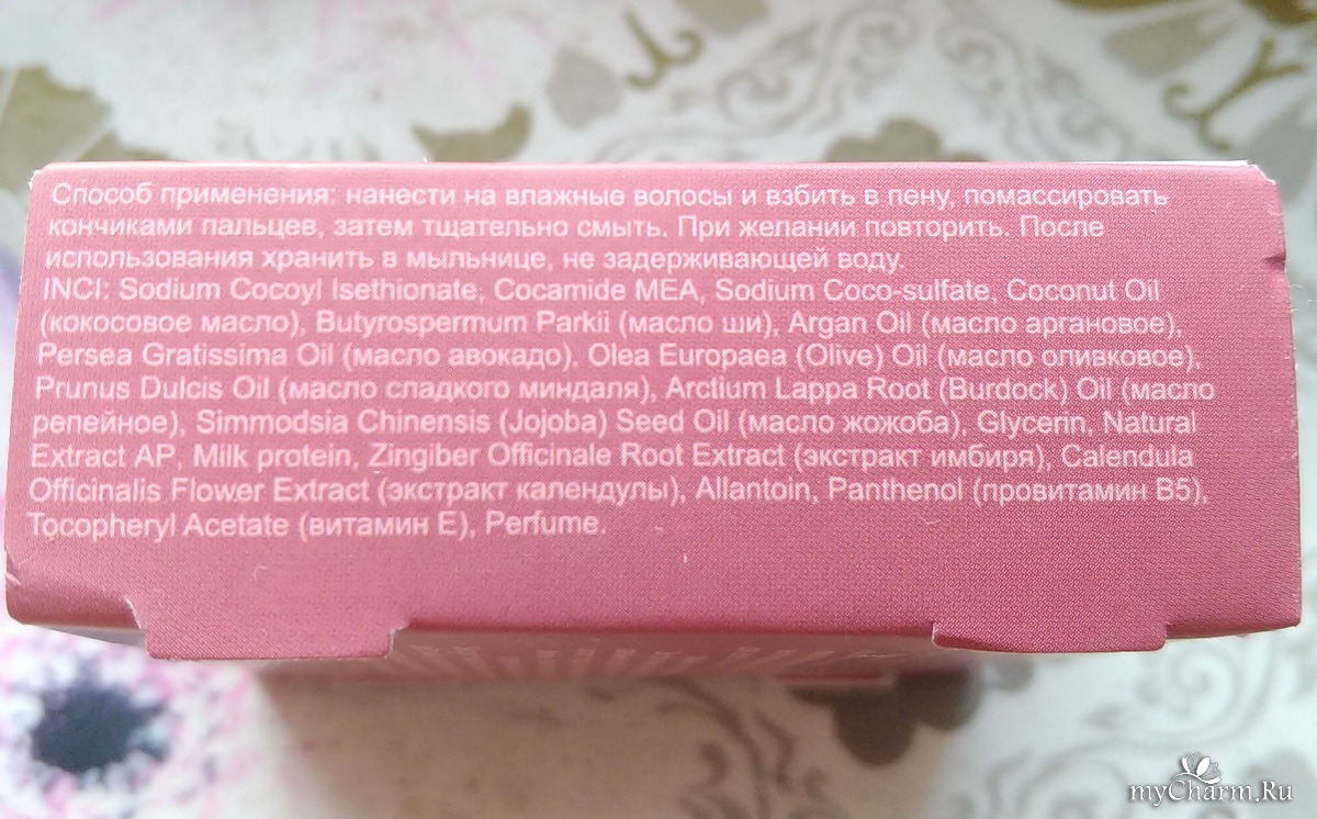 Состав: Sodium Cocoyl Isethionate, Sodium Сoco-Sulfate, Cocos Nucifera (Coconut) Oil (масло кокоса), Butyrospermum Parkii (Shea Butter) Oil (масло ши), Argania Spinosa (Argan) Kernel Oil (масло аргановое), Persea Gratissima (Avocado) Oil (масло авокадо), Olea Еuropaea (Olive) Oil (масло оливковое), Prunus Amygdalus Dulcis (Sweet Almond) Oil (масло сладкого миндаля), Arctium Lappa (Burdock) Root Oil (масло репейное), Simmondsia Chinensis (Jojoba) Seed Oil (масло жожоба), Glycerin, Betaine (бетаин), Мilk Powder, Zingiber Officinale (Ginger) Root Extract (экстракт имбиря), Calendula Officinalis Flower Extract (экстракт календулы), Allantoin, Panthenol (провитамин В5), Tocopheryl Acetate (витамин Е), Parfum.