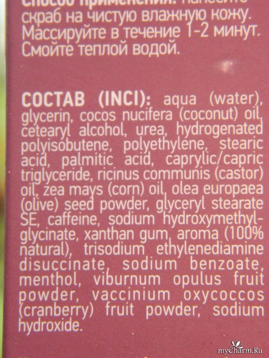 Состав: Дробленые косточки оливы, масла кукурузное и кокосовое, кофеин, ментол, сибирские ягоды: калина, клюква