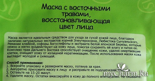 Не плохая маска для лица с восточными травами. Маска тканевая, одноразовая. Имеет приятный запах. Не липкая. Ткань хорошо распределяется на лице и плотно прилегает. Пропитана косметическим средством достаточно, не течет. Не требует смывания. После применения кожа увлажненная, гладкая и бархатистая. Выравнивает цвет лица. Отличный вариант, чтоб взять с собой в дорогу. Удобно хранить.