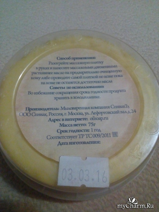 Продукт с натуральным составом просто не может не помочь в борьбе за красоту кожи! Для нанесения средства на кожу необходимо подержать плитку в руках, чтобы растаяло масло или же сразу приступать к массажу самой плиткой. Продукт эффективен не только в борьбе с целлюлитом, но и для смягчения огрубевшей кожи. Имеет невысокую стоимость.