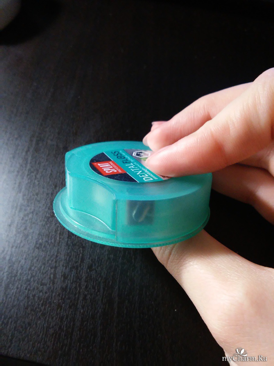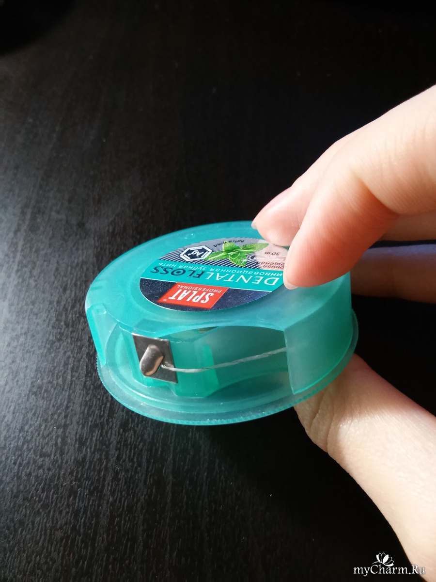 Вообще нить хорошая. Удобная упаковка, которая при поворачивании верхней крышечки открывается/закрывается - это гигиенично. Нить отрывается, т. к. есть специальное приспособление для этого - чтобы зацепить и "обрезать" ее (последнее фото). Сама она с мятным привкусом, что приятно.. Чистит хорошо, но иногда раскручивается, т. к. представляет из себя 2 скрученные нити - обычная вощеная белая и та самая серебряная.