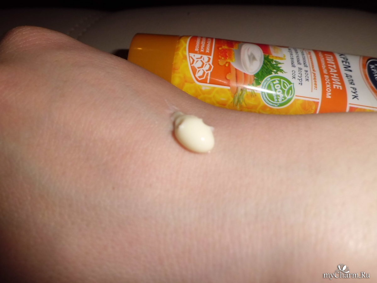 В составе крема содержатся такие натуральные ингредиенты, как масло ши, кукурузное масло, пчелиный воск, экстракт моркови, йогурт и мед. Все они насыщают витаминами и очень хорошо увлажняют кожу рук. Мне в день достаточно одного нанесения крема, чтобы кожа не трескалась и не шелушилась. Крем желтого цвета, довольно густой. Имеет приятный медовый запах. Впитывается быстро и не оставляет жирных следов, что мне и нравится. Этот крем стал настоящим спасением для моих рук. Рекомендую всем! Этот продукт упоминается в следующих материалах сайта: