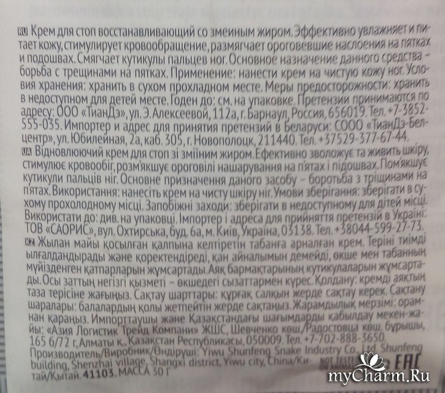 myCharm.Ru → TianDe Крем для стоп восстанавливающий со змеиным жиром