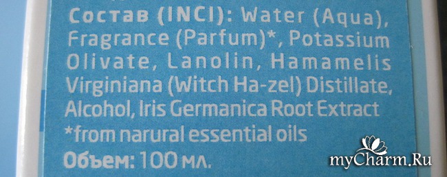 Состав: Вода Аромат Соль калия из жирных кислот оливкового масла Экстракт корня ириса Дистиллят гамамелиса Ланолин Спирт Глицерин Лимонен* 1 Линалоол* 1 Цитраль* Гераниол*