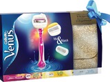 В бритве Venus&Olay соединились инновационные технологии Venus и Olay, поэтому помимо чистого комфортного бритья она одновременно обеспечивает превосходный уход за кожей. Система пяти лезвий Venus бережно отшелушивает ороговевшие клетки, а встроенные увлажняющие подушечки Olay помогают сохранять естественный уровень увлажненности даже без геля для бритья, благодаря чему кожа становится невероятно мягкой, нежной и сияющей. В новый подарочный набор включены сразу две кассеты Venus&Olay: розовый со сладким ароматом сочных ягод и золотой с тонкими парфюмерными нотками ванильного крема.