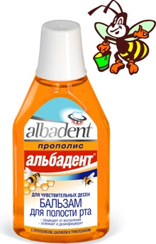 Поэтому силами петербургских ученых появился Лечебно-профилактический Бальзам «Альбадент – прополис» для чувствительных десен. Этот продукт не просто дезинфицирует и приятно освежает полость рта, он поможет быстро справиться с воспалением десен и слизистой, снизит кровоточивость, снимет боль и ускорит заживление микротравм. В одной команде с прополисом «работают» признанное противовоспалительное и кровоостанавливающее средство – экстракт шалфея и сильнейший антибактериальный агент, снижающий образование зубного налета триклозан.