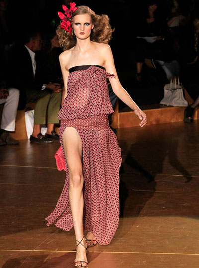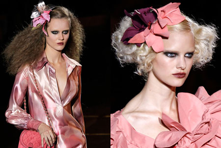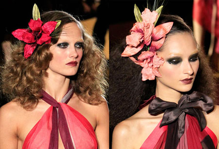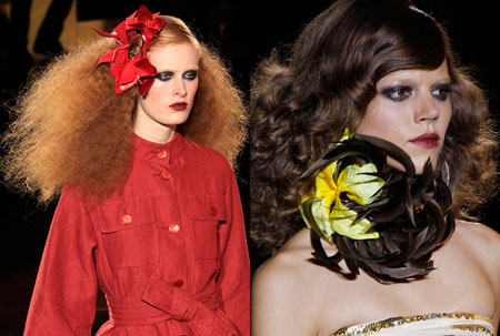 4. Показ Marc Jacobs, пожалуй, предложил один из наиболее ярких образов. Хотя нельзя сказать, что это что-то революционно новое, всё это мы видим каждый год в той или иной степени у разных дизайнеров. Цветы, вплетенные в волосы, создают запоминаемость. А в целом – это знакомые нам 30-е, волосы с эффектом химической завивки, гладкие у корней и начесанные на концах.