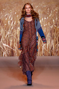 2. Показ Anna Sui также возвращает нас во времена хиппи и романтических длинноволосых девушек. Легкая волна на концах и гладкие волосы на макушке – вот и весь секрет модного образа. Да, ещё девушки демонстрировали красивый золотистый оттенок.