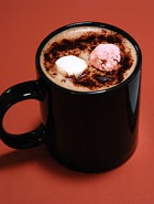 Способ приготовления: Смешать горячий эспрессо и шоколад, на медленном огне вливать остальные ингредиенты, помешивая вилкой. Украсить лепестками мяты.