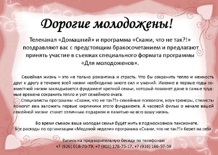 Дорогие молодожены! Телеканал «Домашний» и программа «Скажи, что не так?!» поздравляют вас с предстоящим бракосочетанием и предлагают принять участие в съемках специального формата программы «Для молодоженов».