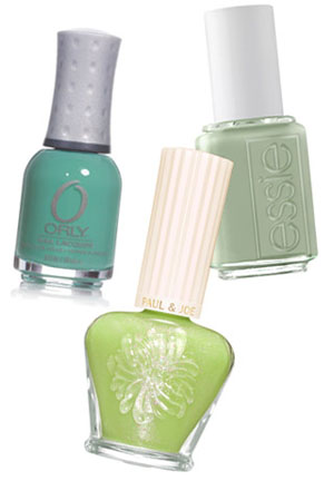 На фото: лак оттенка Ancient Jade от Orly, лак Paul & Joe оттенка Dapple, оттенок Daffy Dil от OPI.