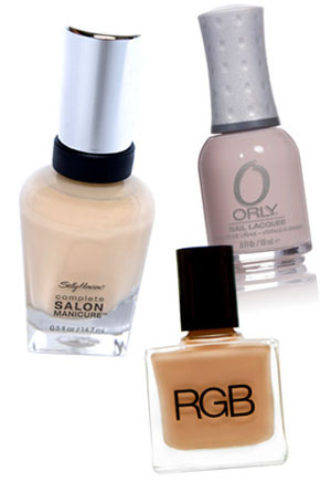 На фото: оттенок Without a Stitch от Sally Hansen, оттенок Beach от RGB, оттенок Pure Porcelain от Orly.