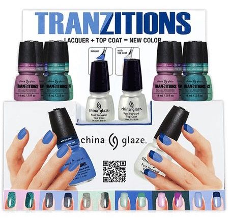 Любимый бренд всех бьюти-блоггеров China Glaze, этой зимой, представит коллекцию лаков Tranzitions, позволяющих создавать двухцветный маникюр при помощи топового покрытия. Для создания такого эффекта следует сначала покрыть ногти обычным лаком, а затем нанести на половину ногтя top coat.