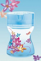 Внешняя упаковка также основана на экзотической цветочной тематике с множеством цветов на синем фоне. Флакончик включает такую же иллюстрацию, выполненную по специальной трехмерной технологии.